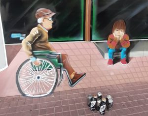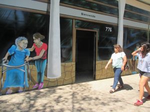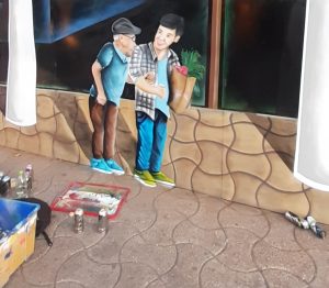 En cuanto a las dificultades que le presentó cubrir el metal de Coocretal, Ricardo precisa que el principal desafío fue hacer coincidir el piso con el mural, de tal manera de generar una unidad. “Congeniar el piso, ver la dimensión, que de lejos se viera como que hay una profundidad, porque igual del terreno nos subimos un par de centímetros, entonces había que lograr todo el tema de perspectiva para que los personajes calzaran con la misma postura del transeúnte”.
