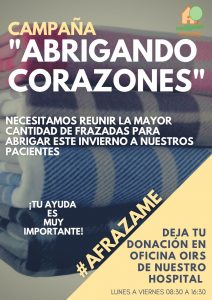 “Nosotros necesitamos frazadas de plaza y media, que son las que usan las camas clínicas. La verdad que tampoco es para que la gente vaya y compre, no necesitamos frazadas de un alto costo sino que sea algo abrigador, cómodo y calentito para los pacientes y pueden venir a dejarlo a la Oficina de la OIRS del hospital o si gustan pueden, juntarse varios amigos, vecinos, organizaciones o instituciones y traerlos directamente a la Oficina de la Multigremial”, señaló Paola Venegas, quien indicó que los guardias de la portería tienen conocimiento de la campaña y pueden orientar a quienes acudan con este donativo para que puedan pasar a dejarlo.