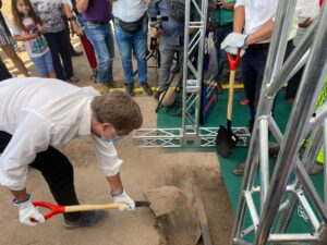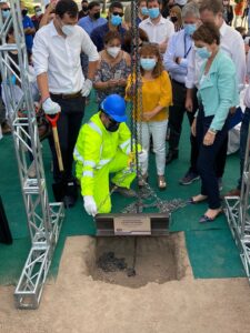 La Ministra de Transportes y Telecomunicaciones, Gloria Hutt junto al Presidente de EFE Trenes de Chile, Pedro Pablo Errázuriz, encabezaron esta mañana la actividad de inicio de obras de la futura Estación Tres Poniente, del proyecto Tren a Melipilla, cuya construcción se realizará en paralelo a la habilitación de las estaciones Vespucio y Ciudad Satélite, lo que se suma a diversas obras civiles iniciadas en abril de 2021.