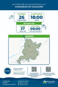 “Efectivamente, Aguas Andinas informó que este día miércoles 26, a partir de las 18:00 horas hasta el día de mañana, cercano a las 6 de la mañana, se va a realizar un corte de agua que va a afectar a diversos sectores de nuestra comuna, que viene a ser como el casco urbano de nuestra comuna, cuyos límites o el perímetro serán las calles: José Brancoli con camino a Melipilla hacia el sector de Río Petrohué; las inmediaciones de calle Larraín y Rafael Calderón; y hacia la Autopista del Sol, Villa Carlos Droguett y el Hospital de Talagante”, recordó y precisó el Concejal Sebastián Rosas.