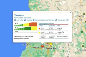 Por su parte, Talagante registraba en distintos horarios durante la jornada de esta tarde nivel de “ALERTA” en relación al material particulado MP 2,5, el más complejo para la salud, y en el nivel de “REGULAR” para el material particulado MP 10, cuando nuestro medio Talagante Online realizó monitoreos a las 14:41 y a las 16:21 horas sobre los registros de la estación de la Calidad del Aire dependiente del Ministerio de Medio Ambiente y que se encuentra ubicada en la Parque Balneario Tegualda.