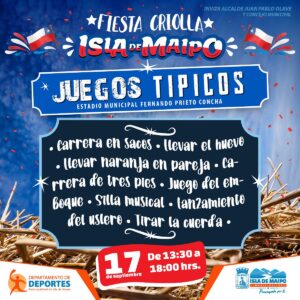 Con un Campeonato de Rayuela comenzará la Fiesta Criolla de Isla de Maipo, en el Cancha 1 del Estadio Municipal Fernando Prieto Concha este sábado 16 de septiembre, a contar de las 15:00 horas. En la justa rayuelera competirán los clubes: San Antonio de Naltahua, El Manzano, Rayuela La Islita, Rayuela Las Mercedes, todo bajo la organización del Departamento de Deportes y el patrocinio de la Municipalidad de Isla de Maipo.