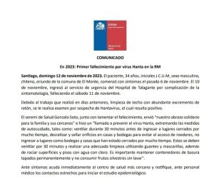 Hasta ahí, el comunicado de prensa de la Secretaria Regional Ministerial de Salud de la Región Metropolitana que informó del primer caso de Hantavirus con resultado de muerte este 2023.