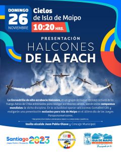 En tanto, los Halcones de la Fuerza Aérea de Chile regresan a la zona, ahora, por segunda vez a la comuna de Isla de Maipo para resaltar esta segunda fecha del Paraciclismo. En tal sentido, la Municipalidad de Isla de Maipo confirmó “el espectáculo de acrobacias de los Halcones de la Fuerza Aérea de Chile (FACh), con pilotos experimentados en acrobacias aéreas y un show exclusivo para los Parapanamericanos en Isla de Maipo, este domingo, desde las 10:20 horas.