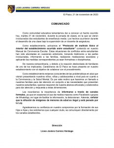 “Nos ocupa, es una realidad que lamentamos, que nuevamente en un establecimiento de la comuna de El Monte haya existido un hecho de violencia, por el reporte que ya tengo de parte de la dirección del establecimiento, Javiera Carrera. Fue en un curso de tercero medio donde hubo, en este caso, una pelea, hay una estudiante que agrede a otro estudiante y ese otro estudiante, obviamente, reacciona también, lamentablemente, dentro de una sala de clases”, precisó el Director Provincial de Educación Talagante-Melipilla, Cristián Cartagena.