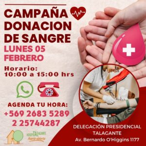 Agregó que por este motivo, el próximo lunes 5 de febrero se llevará a cabo la campaña mensual de Donación de Sangre del Hospital de Talagante, en un punto bastante accesible para los vecinos y vecinas de la provincia. “Estamos tratando de hacer puntos que sean céntricos, que sean de mayor acceso a la comunidad y por eso nos trasladamos a la Delegación Presidencial Provincial, ahí a un costado de la Plaza de Armas de Talagante para que toda la gente pueda ir a donar como altruista o a través también del agendamiento que estamos haciendo a través de la unidad de laboratorio de nuestro hospital”, indicó el funcionario del Hospital de Talagante.