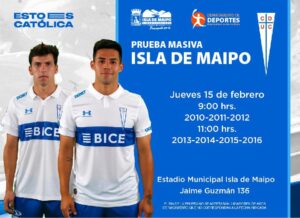 Con el propósito de incorporar a futuras figuras del balompié a sus filas infantiles y juveniles, el Club Universidad Católica realizará una prueba masiva de menores en el Estadio Municipal “Fernando Prieto Concha” de Isla de Maipo, este jueves 15 de febrero, a partir de las 09:00 horas.  Así lo informó el Encargado de Deportes de la Municipalidad de Isla de Maipo, Cristian Mora, quien indicó que la actividad estará dirigida por el Coordinador de Captación de Cruzados SADP y destacada figura de la UC, Mario Lepe.