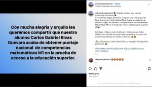 Es importante señalar que Carlos Gabriel Rivas Guevara, ya había ocupado un lugar destacado en el Campeonato Nacional de Matemáticas Enseñanza Media en noviembre pasado, hecho consignado por el establecimiento en sus redes sociales y que sin duda destaca las competencias y habilidades de este alumno, que ahora destaca por su puntaje nacional en esta misma asignatura.