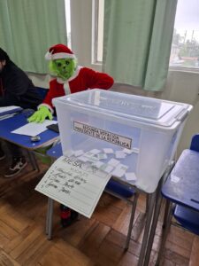 “No mencionan nada, o sea, ahora cuando salimos, los chicos de las mesas de al lado si me miran y se ríen nomás, y ya, el Grinch. Pero acá, por lo menos, ha sido todo normal, un par de personas se han reído, pero todo tranquilo”, comentó de manera espontánea Diego Prieto, quien tras concedernos la entrevista regresó a su labor como vocal de mesa, junto a la urna de votación de la mesa 136 del Liceo de Talagante, local 2.